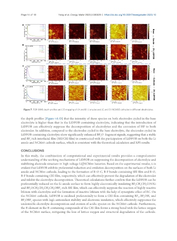 Figure 7. TOF-SIMS depth profiles and 2D mapping of (A and B) Li anodes and (C and D) NCM85 cathodes in different electrolytes.