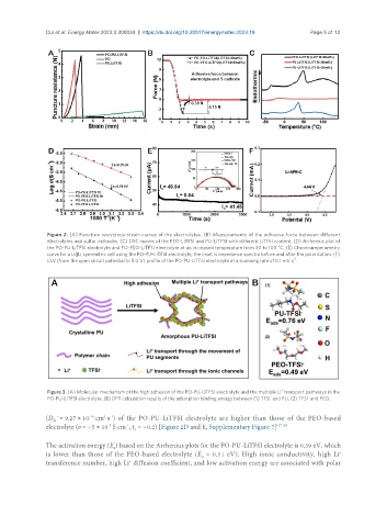 Figure 3. (A) Molecular mechanism of the high adhesion of the PO-PU-LiTFSI electrolyte and the multiple Li transport pathways in the