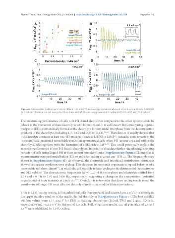 Figure 4. Galvanostatic tests on symmetrical lithium cells at 60 °C. (A) Average potentials achieved at each current density from 0.01