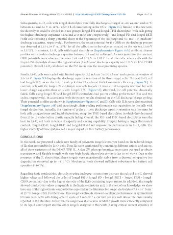 2.0-3.6 V. Figure 5D displays the discharge capacity retention of the three iongel cells. The best Li-O cell
