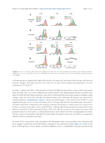 electrolytes; C 1s, F 1s, and S 2p XPS spectra of NCM811 electrodes after 100 cycles with (C) fluorinated ether and (D) carbonate