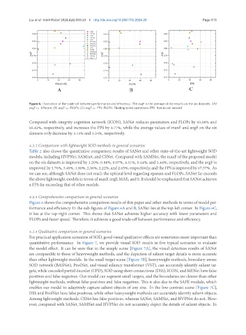 formance and efficiency. In the sub-figures of Figure 6A and B, SANet lies at the top-left corner. In Figure 6C,