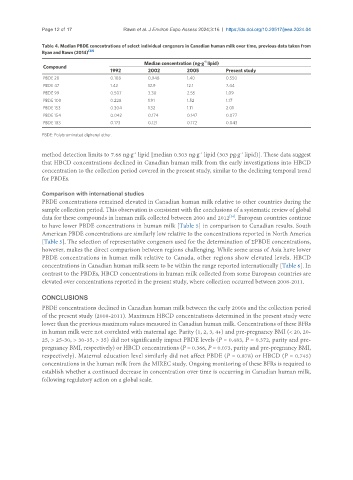 Table 4. Median PBDE concentrations of select individual congeners in Canadian human milk over time, previous data taken from