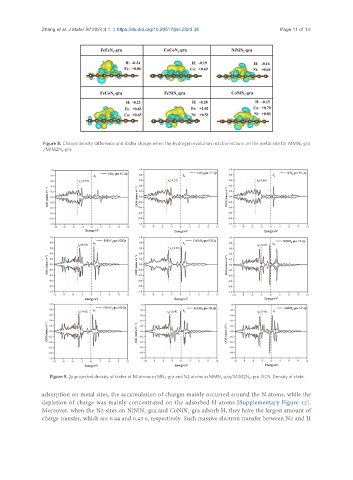 Figure 8. Charge density difference and Bader charge when the hydrogen evolution reaction occurs on the metal site for MMN -gra