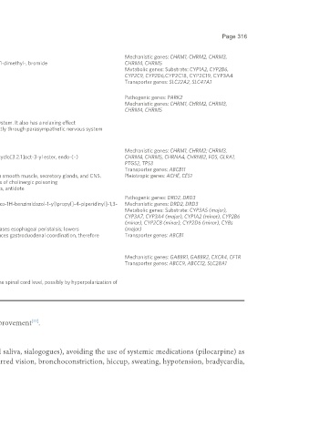 Mechanism: Blocks the action of acetylcholine at parasympathetic sites in smooth muscle, secretory glands, and CNS. Pleiotropic genes: ACHE, CES1