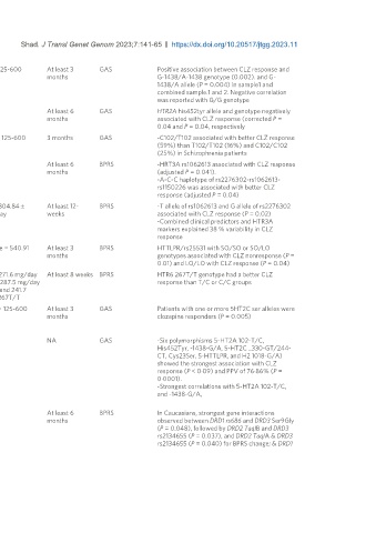 Souza et al., HRT3A rs1062613 140 Caucasian and African NA At least 6 BPRS -HRT3A rs1062613 associated with CLZ response