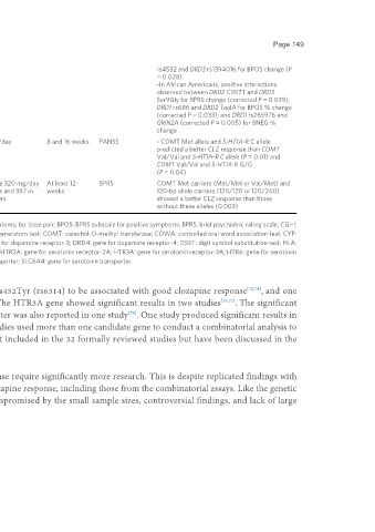 Rajagopal et al., -DRD4 120 bp duplication 93 Indian Average dose 320 mg/day At least 12- BPRS COMT Met carriers (Met/Met or Val/Met) and