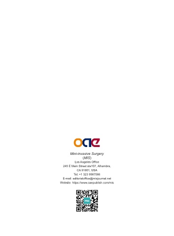 Mini-invasive Surgery (MIS) Los Angeles Office 245 E Main Street ste107, Alhambra, CA 91801, USA Tel: +1 323 9987086 E-mail: editorialoffice@misjournal.net Website: https://www.oaepublish.com/mis