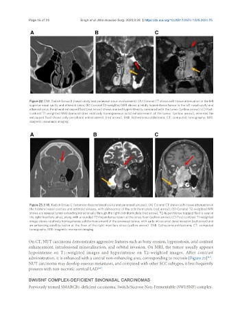 ethmoid sinus. Peripheral entrapped fluid (red arrow) shows marked hyperintensity compared with the tumor (yellow arrow); (C) Post-
