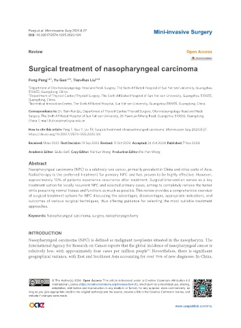 How to cite this article: Pang F, Guo Y, Liu TR. Surgical treatment of nasopharyngeal carcinoma. Mini-invasive Surg 2024;8:27.