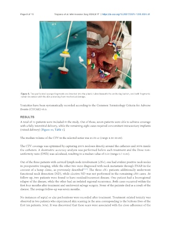 The CTV coverage was optimized by capturing 200% isodoses directly around the catheters and 300% inside