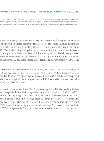 organ-preserving bariatric procedure [14,15] . Since then, it has gained momentum as a less invasive and safer alternative to traditional bariatric surgery. ESG is the