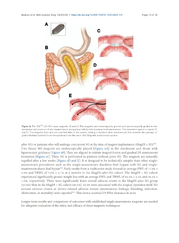 duodenum and ileum to initiate magnet fusion and gradual side-to-side duodeno-ileal anastomosis. The mesenteric space is closed; (D