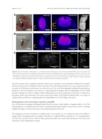 Figure 5. MRI of ICH and ICH-based device. (A, from left to right) Photograph of ICH at the time of implantation, axial and coronal view