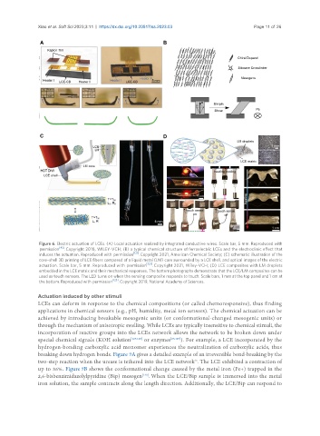 Figure 6. Electric actuation of LCEs. (A) Local actuation realized by integrated conductive wires. Scale bar, 5 mm. Reproduced with