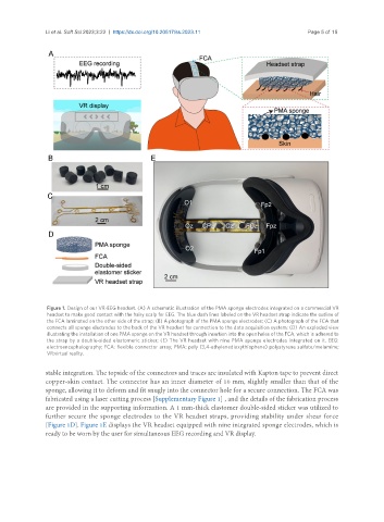 the strap by a double-sided elastomeric sticker; (E) The VR headset with nine PMA sponge electrodes integrated on it. EEG: