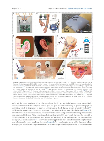 permission [246] . Copyright 2016, The Authors; (B) A wearable smart band for detecting sweat-based glucose and vital signs. Reproduced