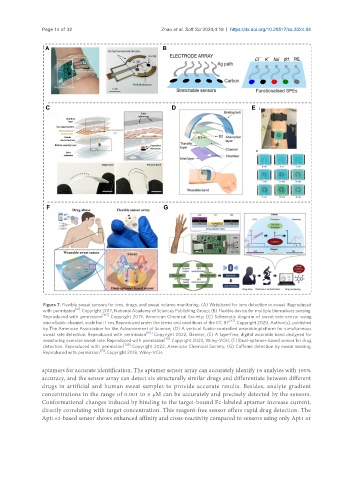 monitoring exercise sweat rate. Reproduced with permission [111] . Copyright 2023, Wiley-VCH; (F) Dual-aptamer-based sensor for drug