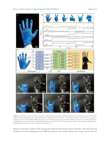 sensing glove as a soft controller to manipulate the machine hand; (D) The left hand, wearing a strain-sensing glove, manipulates the