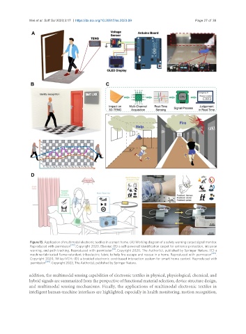 Figure 13. Application of multimodal electronic textiles in a smart home. (A) Working diagram of a safety warning carpet signal monitor.