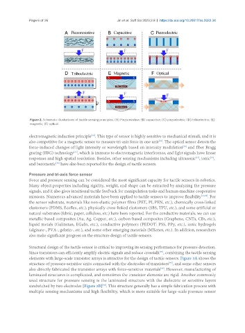 Figure 2. Schematic illustrations of tactile sensing principles: (A) Piezoresistive; (B) capacitive; (C) piezoelectric; (D) triboelectric; (E)