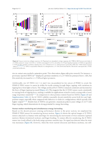 LF-TENG sensors in range-I (0.0245 to 1.23 kPa) and range-II (2.45 to 23.3 kPa); (C) Finger tapping response of PDMS-encapsulated