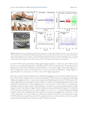 finger bending angles of 30°, 60°, and 90°; (D) Demonstration of energy harvesting from walking and jogging motions; (E) Voltage