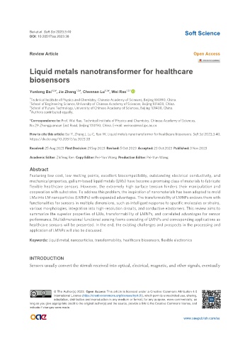 How to cite this article: Bai Y, Zhang J, Lu C, Rao W. Liquid metals nanotransformer for healthcare biosensors. Soft Sci 2023;3:40.