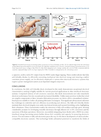 Time-dependent output voltage of the PENG (C), the PENG integrated with a bridge rectifier (D), and the PENG integrated with the