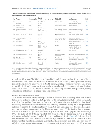 Table 1. Comparison of stretchability, electrical conductivity (or sheet resistance), conductive materials, and the applications of