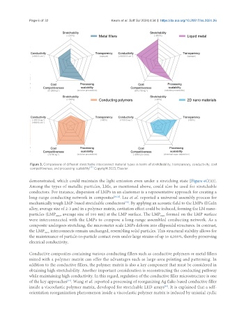 Figure 3. Comparisons of different stretchable interconnect material types in terms of stretchability, transparency, conductivity, cost
