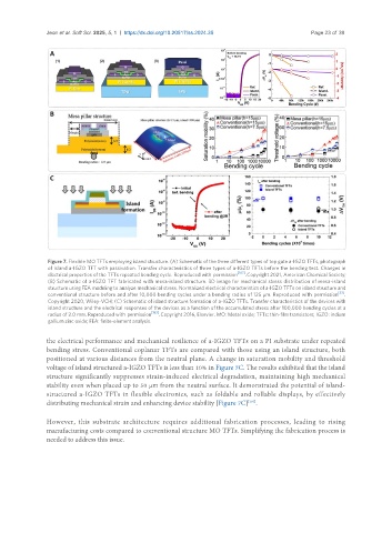 Figure 7. Flexible MO TFTs employing island structure. (A) Schematic of the three different types of top gate a-IGZO TFTs, photograph