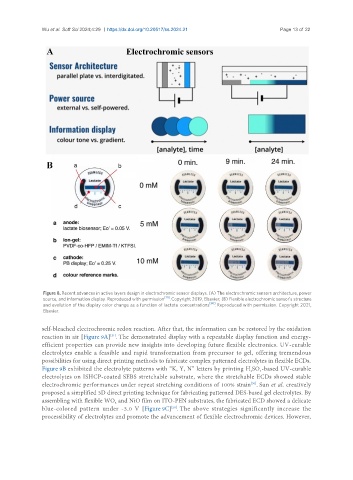 source, and information display. Reproduced with permission [111] . Copyright 2019, Elsevier; (B) Flexible electrochromic sensor’s structure