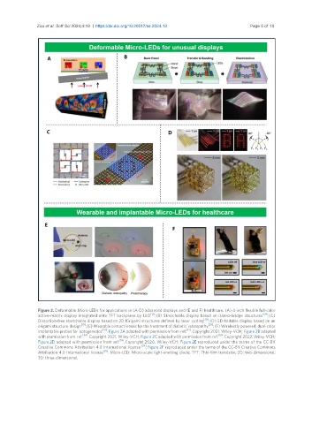 Figure 2. Deformable Micro-LEDs for applications in (A-D) advanced displays and (E and F) healthcare. (A) 4-inch flexible full-color