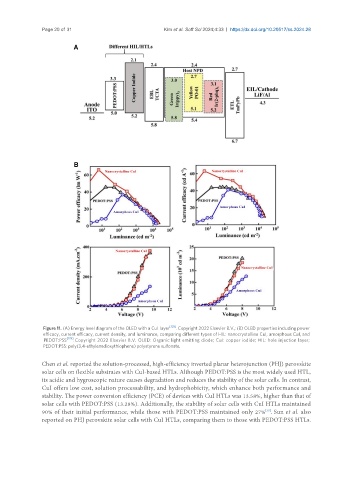 Figure 11. (A) Energy level diagram of the OLED with a CuI layer [128] . Copyright 2022 Elsevier B.V.; (B) OLED properties including power