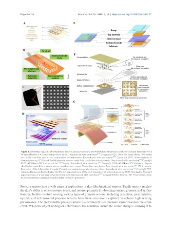 Figure 3. Schematic diagrams of temperature sensors, pressure sensors, and multifunctional sensors. (A) Layer-by-layer description of a
