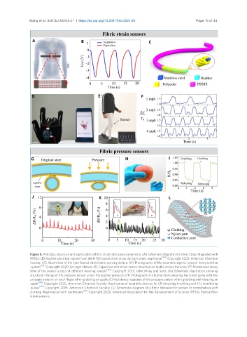 Figure 8. Principle, structure and application of fibric strain and pressure sensors. (A) Schematic diagram of a chest strap integrated with