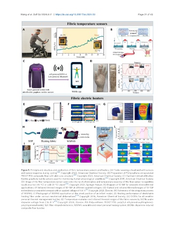 Figure 9. Principle and structure and application of fibric temperature sensors and heaters. (A) Tester wearing a headband with sensors
