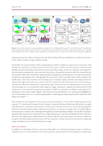 Figure 5. The construction and microwave absorption properties of (A) Ni/MXene/RGO aerogel [116] and (B) WCC foams [117] with different